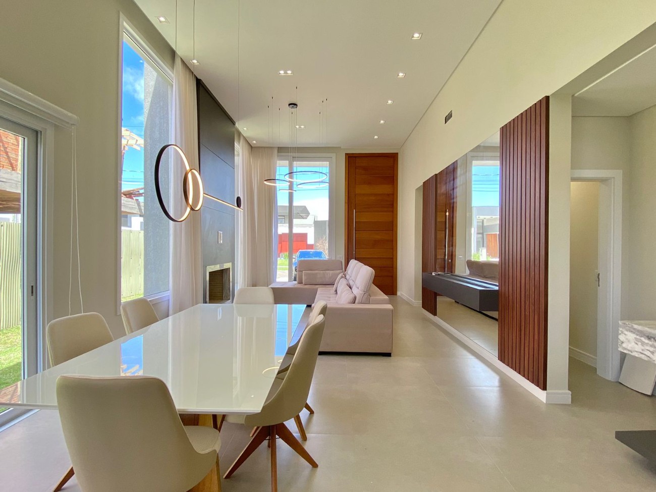 Excelente casa em condomínio fechado, com 4 dormitórios com suíte, mobiliada, lareira, gás central, área de serviço, churrasqueira, forro de gesso com iluminação projetada em led, garagem pra 2 carros.